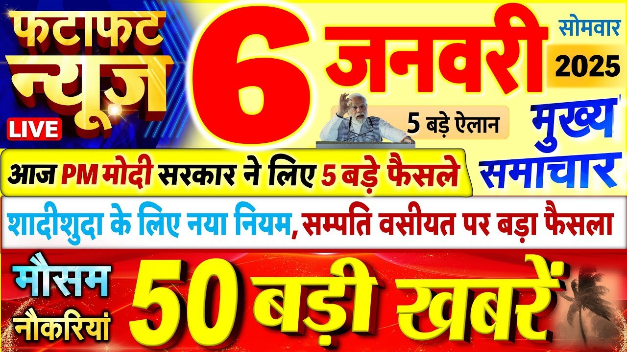 Today Breaking News ! आज 06 जनवरी 2025 के मुख्य समाचार बड़ी खबरें PM Modi, SBI, weather, Bank, CAB , Nonstop News | आज की ताजा ख़बरें | News Headlines | 06 January 2025 | Fatafat khabren || LIVE News | News Headlines | today news | Fatafat khabren | News in hindi | govnews # 06_January_2025 | #Today_Breaking_News | #मुख्य_समाचार | #Today_News_headlines | # 06_January_2025 #modi #video #watch #मौसम #विभाग #weather आज 06 January 2025 का मौसम